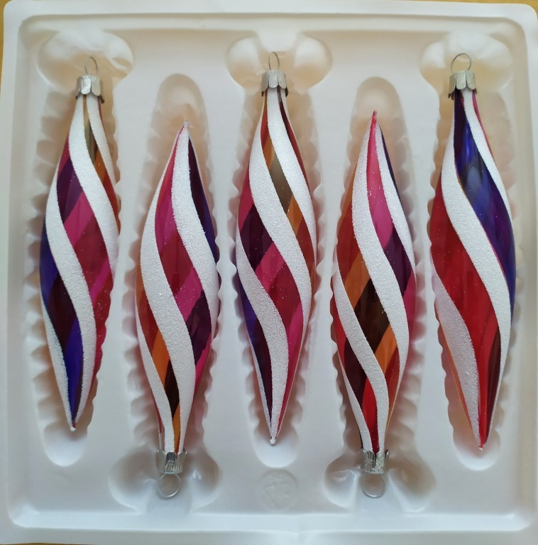 Skleněná vánoční ozdoba ve tvaru rakety, hladká, průhledná, barva ass, lesk, malovaný bílý dekor, velikost14x3 cm, foto ilustrační