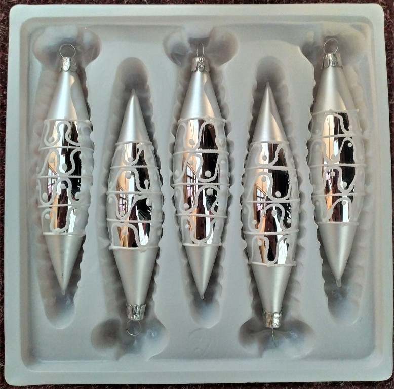 RAKETA KROUCENÁ, SKLENĚNÁ VÁNOČNÍ OZDOBA, STŘÍBRNÁ,, RETRO DEKOR