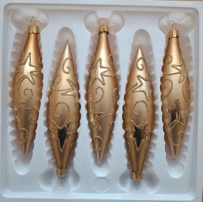 Skleněná vánoční ozdoba ve tvaru rakety, hladká, zlatá, mat, plast. dekor, velikost 14x3 cm. Foto ilustrační