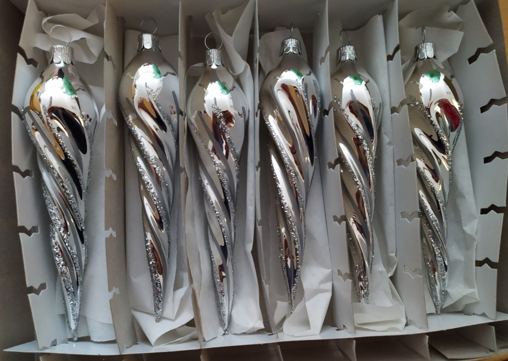 Skleněná vánoční ozdoba, volně foukaný tvar, rampouch/krápník kroucený, stříbrný, lesk, dekor, velikost 14x3 cm. Foto ilustrační
