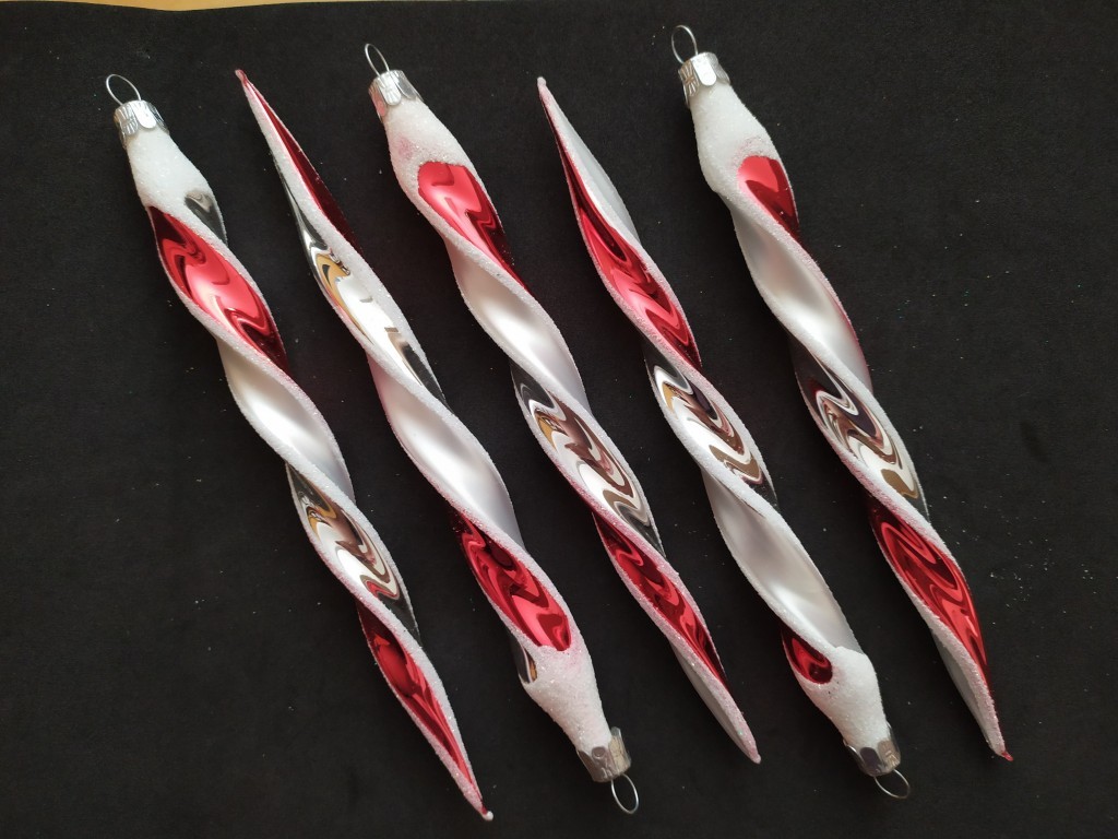 Skleněná vánoční ozdoba, volně foukaný tvar, rampouch kroucený, malovaný, barevný dekor, velikost 20x1,5 cm. Foto ilustrační