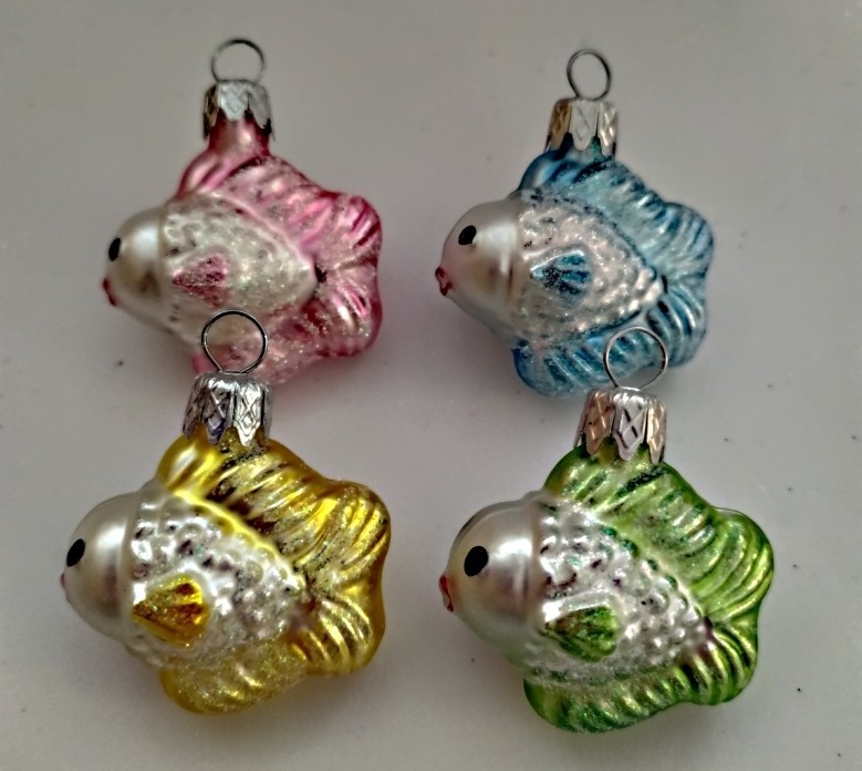 Skleněná ozdoba, forma, barevný dekor, rybka větší barevná, mat, velikost 4 cm. Foto ilustrační, dekor a barva ass, na figurce se může lišit