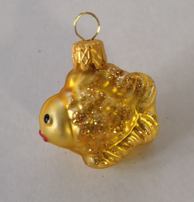 +420 731 683 257vanocniozdoby@slezska-tvorba.czSkleněná ozdoba, forma, barevný dekor, rybka větší zlatá, velikost 4 cm. Foto ilustrační, dekor a barva na figurce se může lišit