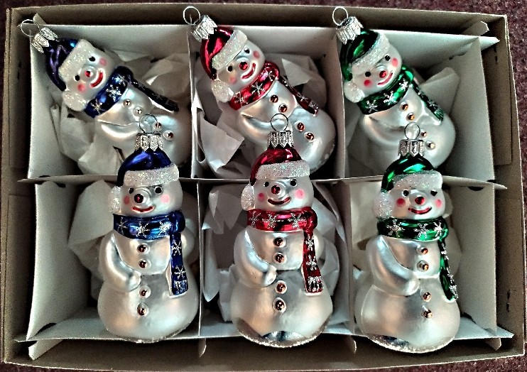 Skleněná vánoční ozdoba, forma, sněhulák s balíčkem, mat, bílý, barevná šála, v balení kombinace 3 variant - červená, modrá, zelená, dekor, velikost 10x5 cm, foto ilustrační.