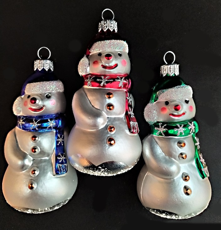 +420 731 683 257vanocniozdoby@slezska-tvorba.czSkleněná vánoční ozdoba, forma, sněhulák s balíčkem, mat, bílý, barevná šála, v balení kombinace 3 variant - červená, modrá, zelená, dekor, velikost 10x5 cm, foto ilustrační.