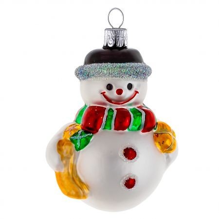 Skleněná vánoční ozdoba, forma, sněhulák s dárkama, mat, bílý, šála barevná, dekor, velikost 8x7 cm. Foto ilustrační