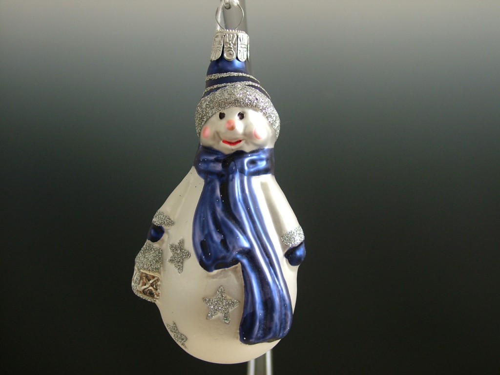 Skleněná vánoční ozdoba, forma, sněhulák s lucernou a hvězdy, bílý, mat,, barevný, dekor, velikost 10x5,5 cm. Foto ilustrační