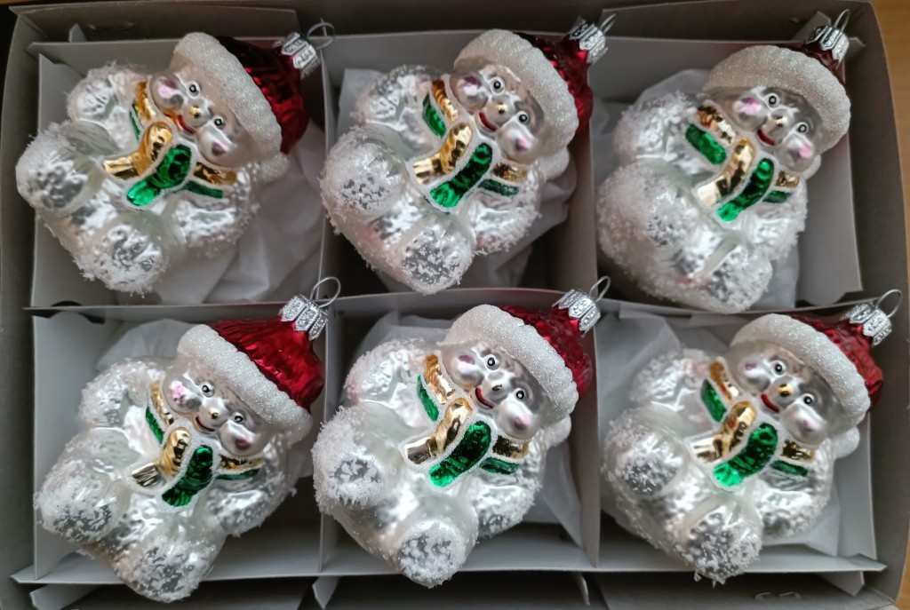 +420 731 683 257vanocniozdoby@slezska-tvorba.czSkleněná vánoční ozdoba, forma, sněhulák sedící, šála barevná, mat, bílý, dekor, velikost 8x6 cm. Foto ilustrační