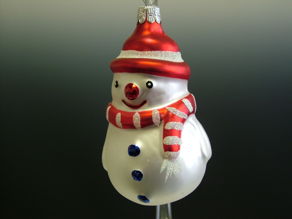 Skleněná vánoční ozdoba, forma, sněhulák velký, šála barevná, mat, bílý, dekor, velikost10x7 cm. Foto ilustrační