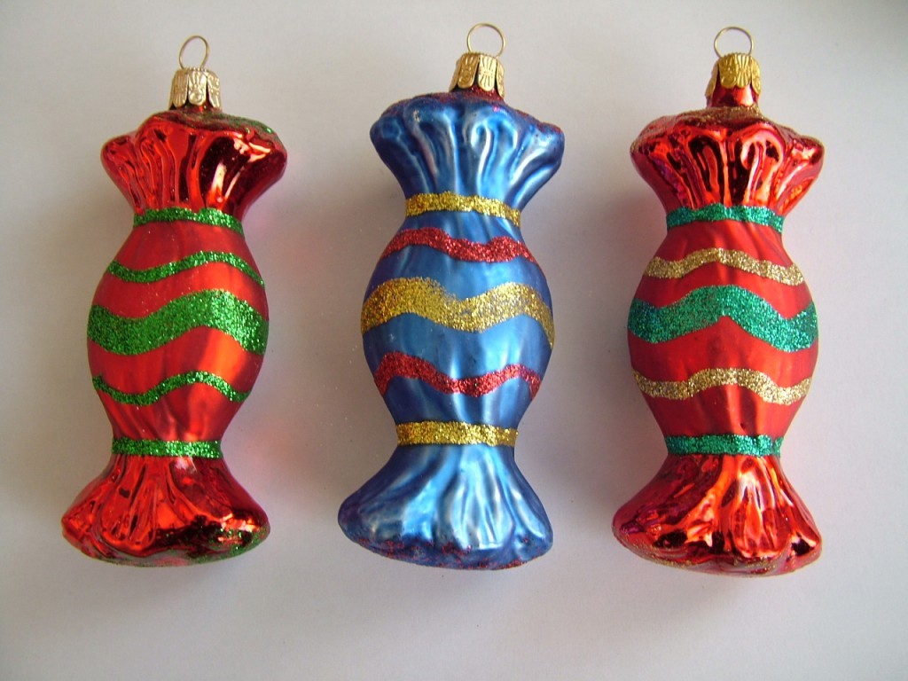 Skleněná vánoční ozdoba, sortiment forem, velké bonbóny, 3 kusy, mat, barevný dekor, velikost 12x4 cm. Foto ilustrační