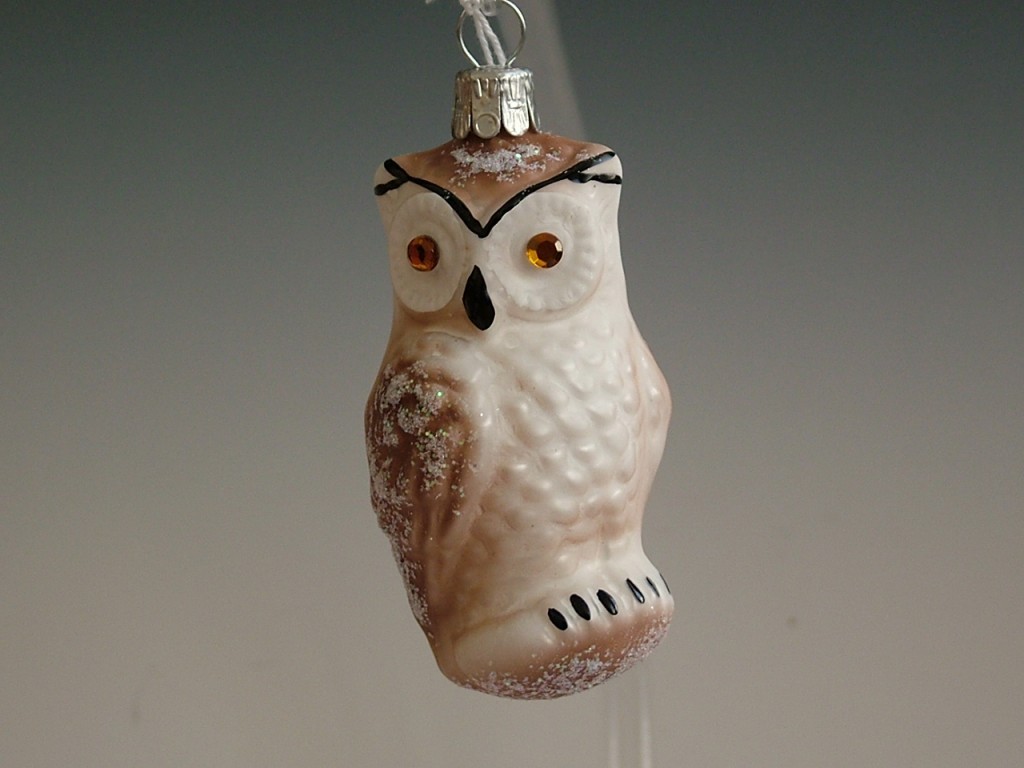 Skleněná vánoční ozdoba, forma, sova, skořápka, stříkaná, oči šaton, barva 2/9121/474,.dekor, černé rámování, velikost 7x4 cm, foto ilustrační