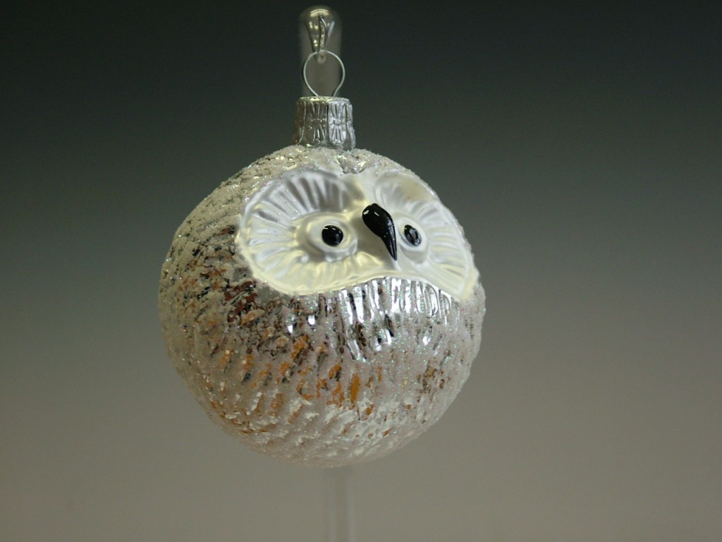 Skleněná vánoční ozdoba, forma, sova kulatá, stříbrná, lesk, dekor, velikost 6 cm. Foto ilustrační