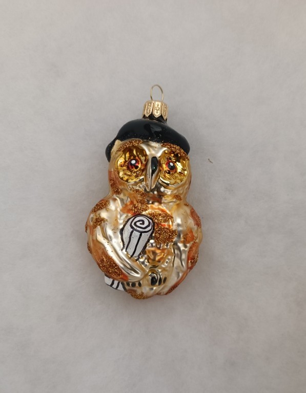 Skleněná vánoční ozdoba, forma, sova moudrá, zlatý dekor, lesk, foto ilustrační. Velikost 9 cm. Limitovaná edice, omezený počet kusů.