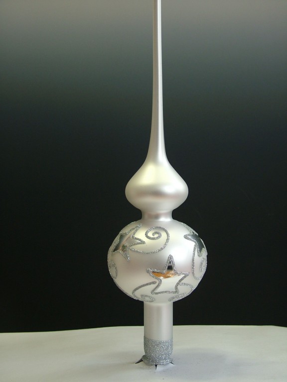 +420 731 683 257vanocniozdoby@slezska-tvorba.czSkleněná vánoční ozdoba ve tvaru špice, 1-kulová, hladká, sbílá, mat, dekor hvězdy, velikost koule 6 cm a 7 cm, foto ilustrační