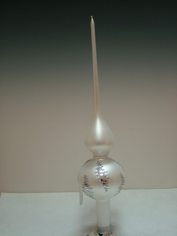 +420 731 683 257vanocniozdoby@slezska-tvorba.czSkleněná vánoční ozdoba ve tvaru špice, 1-kulová, hladká, bílá, mat, dekor cik-cak, velikost koule 6 cm. Foto ilustrační