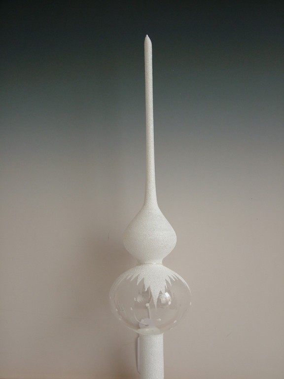 +420 731 683 257vanocniozdoby@slezska-tvorba.czSkleněná vánoční ozdoba ve tvaru špice, 1-kulová, čirá, hladká věžička, dekor bílé rampouchy, velikost koule 6 cm a 7 cm
