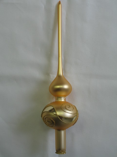 +420 731 683 257vanocniozdoby@slezska-tvorba.czSkleněná vánoční ozdoba ve tvaru špice, 1-kulová, hladká, zlatá, mat, dekor, velikost koule 6 cm a 7 cm, foto ilustrační