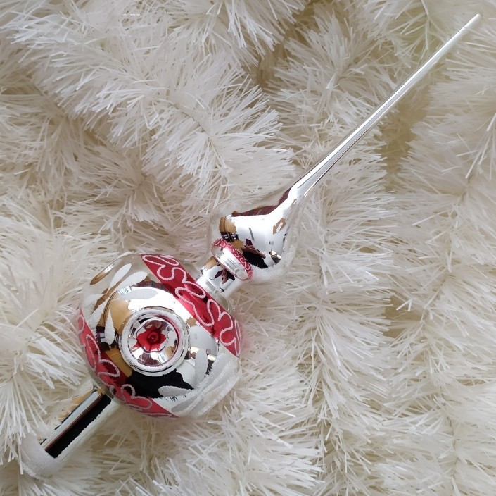 Skleněná vánoční ozdoba ve tvaru špice, 1-kulová, stříbrná, hladká věžička, píchaná, bílo-červený dekor, velikost koule 7 cm, foto ilustrační