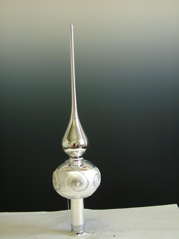 Skleněná vánoční ozdoba ve tvaru špice, 1-kulová, hladká, stříbrná, středem pruh bílým matem, plast. dekor, velikost koule 6 cm/délka špice 26 cm, velikost koule 7 cm/délka špice 28 cm, foto ilustrační