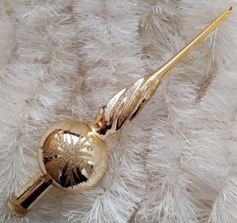 +420 731 683 257vanocniozdoby@slezska-tvorba.czSkleněná vánoční ozdoba ve tvaru špice, 1-kulová, hladká, kroucená věžička, zlatá, lesk, zlatý dekor, velikost koule 7 cm foto ilustrační