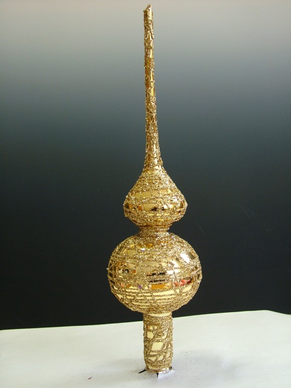 +420 731 683 257vanocniozdoby@slezska-tvorba.czSkleněná vánoční ozdoba ve tvaru špice, 1-kulová, hladká, zlatá, lesk, plast. dekor, velikost koule 6 cm nebo 7 cm, foto ilustrační