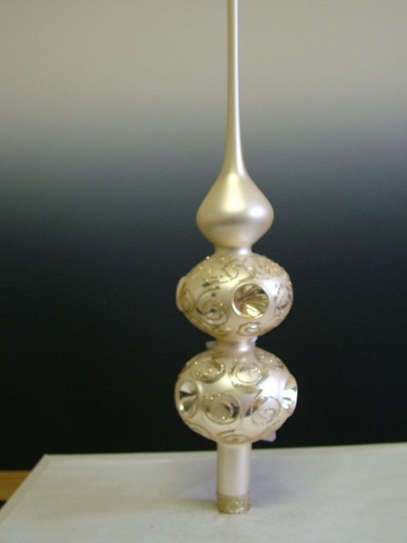 +420 731 683 257vanocniozdoby@slezska-tvorba.czSkleněná vánoční ozdoba ve tvaru špice, 2-kulová, lesk/mat, šampaň, dekor, koule 3x píchané, velikost koule 7 cm, foto ilustrační