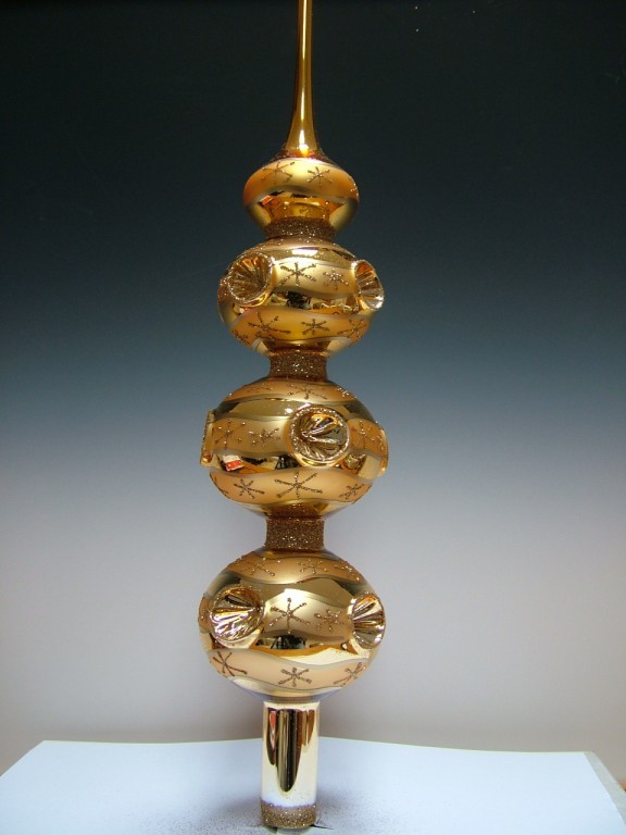 +420 731 683 257vanocniozdoby@slezska-tvorba.czSkleněná vánoční ozdoba ve tvaru špice, 3-kulová, zlatá, lesk, dekor, koule 4x píchané, velikost koule 8 cm, foto ilustrační