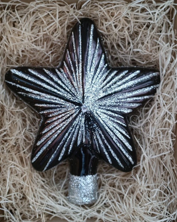 +420 731 683 257vanocniozdoby@slezska-tvorba.czSkleněná vánoční ozdoba, špice hvězda, forma, černá, lesk, stříbrný dekor v kombinaci se 2 šatony, velikost 13 x 15 cm. Baleno v hnědé dárkové lepenkové krabičce/T1, Foto ilustrační