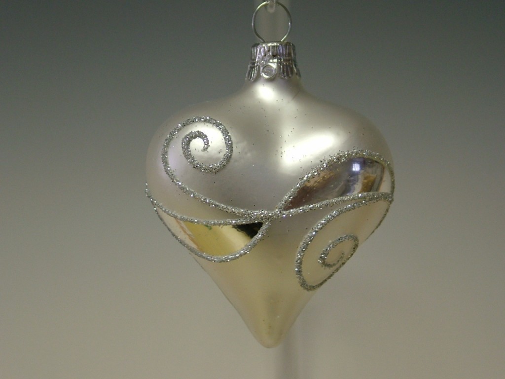 +420 731 683 257vanocniozdoby@slezska-tvorba.czSkleněná vánoční ozdoba ve tvaru srdce, forma, hladké, bílé, mat, plast. dekor, velikost 5,4x5,3 cm, foto ilustrační