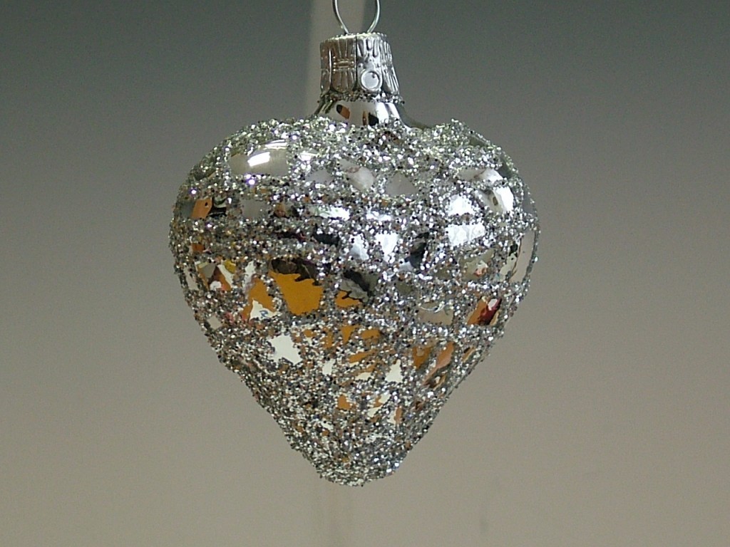 Skleněná vánoční ozdoba ve tvaru srdce, forma, hladké, stříbrné, plast. dekor, velikost 5,4x5,3 cm, foto ilustrační