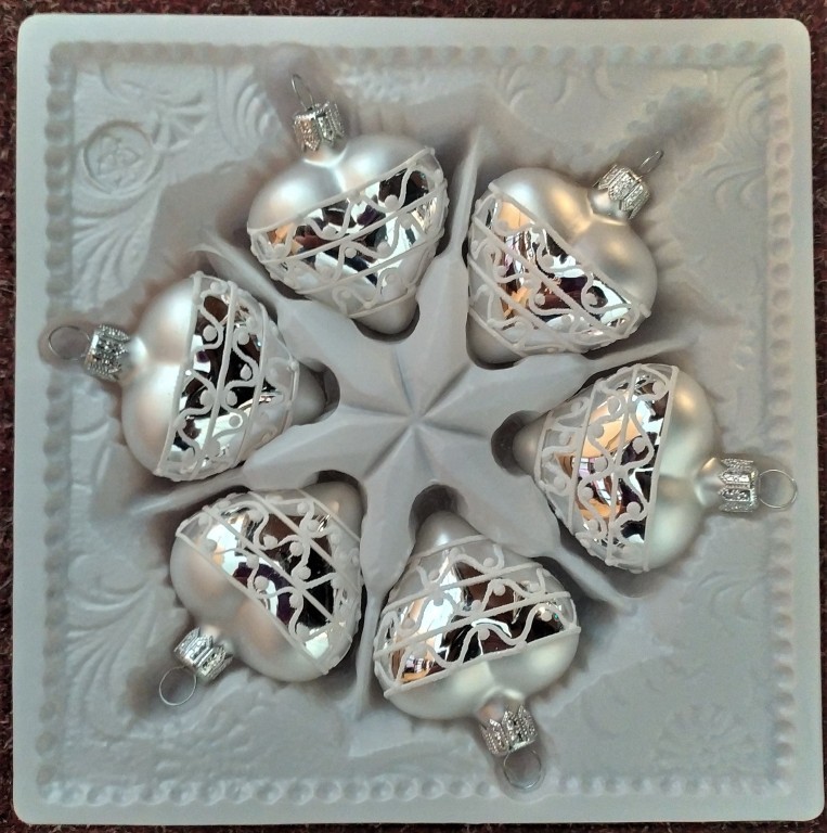 +420 731 683 257vanocniozdoby@slezska-tvorba.czSkleněná vánoční ozdoba ve tvaru srdce, forma, hladké, stříbrné, bílý plastický dekor, velikost 5,4x5,3 cm, foto ilustrační