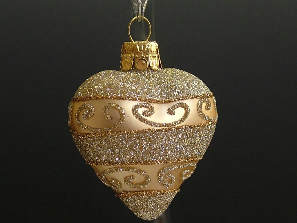 Skleněná vánoční ozdoba ve tvaru srdce, forma, hladké, zlaté, mat, sypaný plastický dekor, velikost 5,4x5,3 cm, foto ilustrační