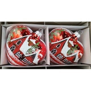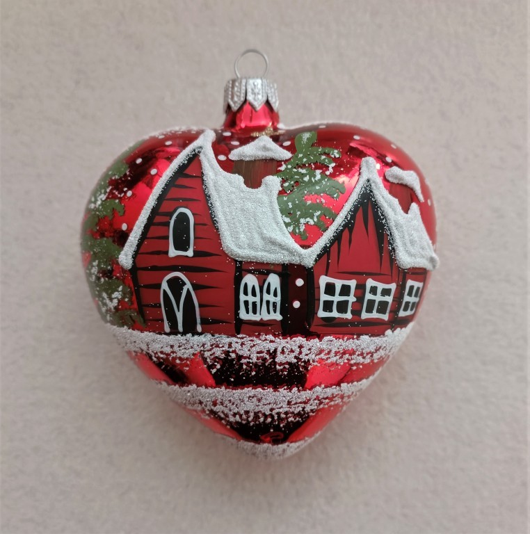 Skleněná vánoční ozdoba, srdce velké, forma, červené, lesk, ručně malovaný plastický dekor, zimní motiv. Foto ilustrační. Velikost 10 cm. Všechny varianty v dárkových krabičkách.