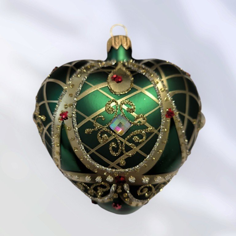 Skleněná vánoční ozdoba ve tvaru srdce, forma, tmavě zelený mat, bohatě zdobený dekor včetně kamenů ručně malovaný, baleno v PET krabičce, velikost 10 cm. Foto ilustrační. Limitovaná série, omezený počet kusů.