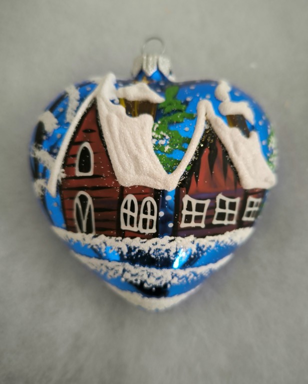Skleněná vánoční ozdoba, srdce velké, forma, modré, lesk, ručně malovaný plastický dekor, zimní motiv. Foto ilustrační. Velikost 10 cm. Všechny varianty v dárkových krabičkách.