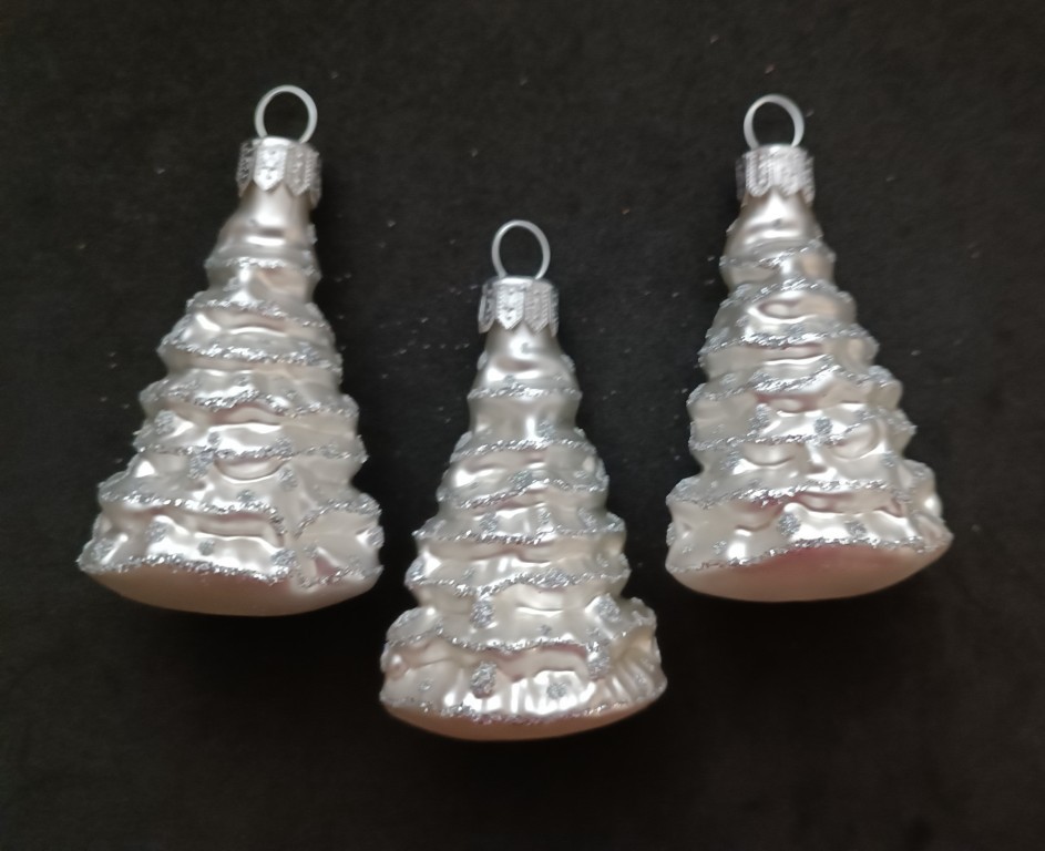 Skleněná ozdoba, forma, ručně zdobená, stromek bílý, mat/lesk, velikost 6 cm, stříbrný dekor. Foto ilustrační