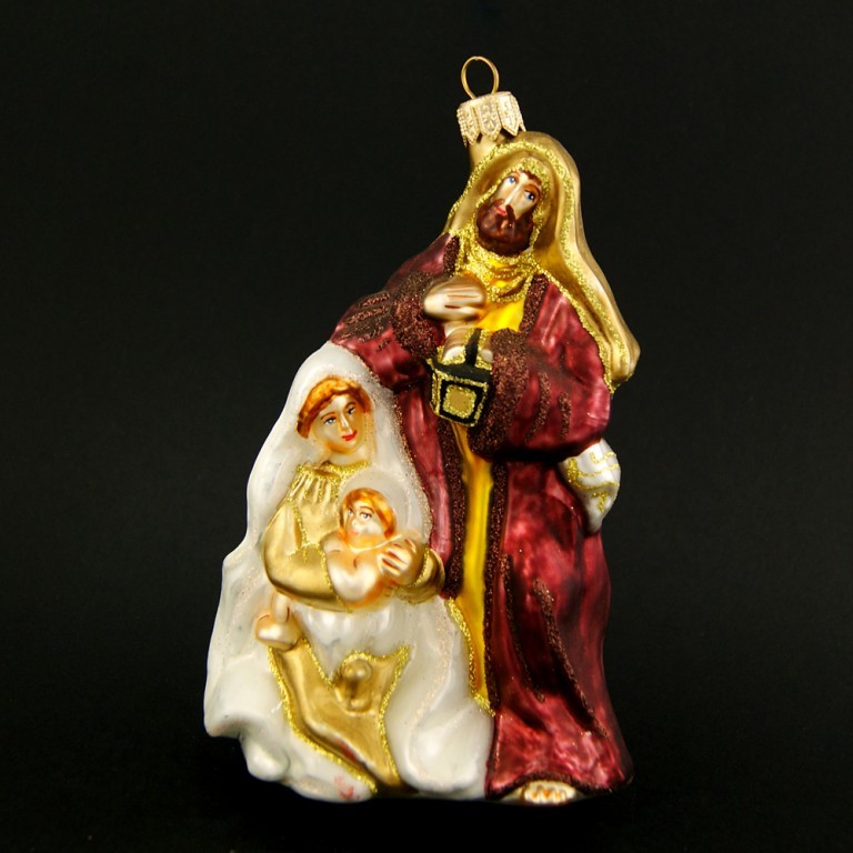 Skleněná foukaná ozdoba, Svatá rodina, forma, lesk/mat, ručně malovaný dekor, velikost 15x10 cm. Hnědá dárková lepenková krabička. Limitovaná série, omezený počet kusů.
