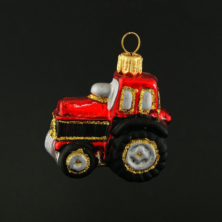 Skleněná ozdoba, forma, traktor, mat/lesk, barevný dekor, velikost 5,5 cm. Foto ilustrační, více variant, dekor a barva na figurce se může lišit dle skladových zásob