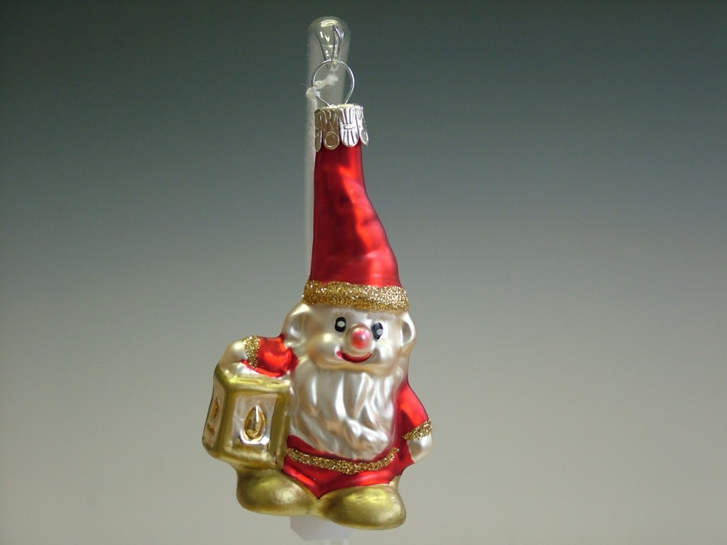 Skleněná vánoční ozdoba, forma, trpaslík s lucernou, mat, barevný, dekor, velikost 6,5x4,5 cm. Foto ilustrační