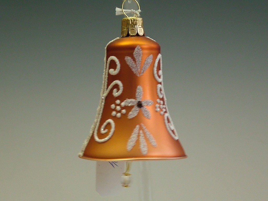 Skleněná vánoční ozdoba, zvonek, dekor perník, hladký, hnědý, mat, plast. dekor, sypaný. Na přední straně plastický dekor. Zadní strana vánoční ozdoby je sypaná, tmavě měděný posyp. Foto ilustrační