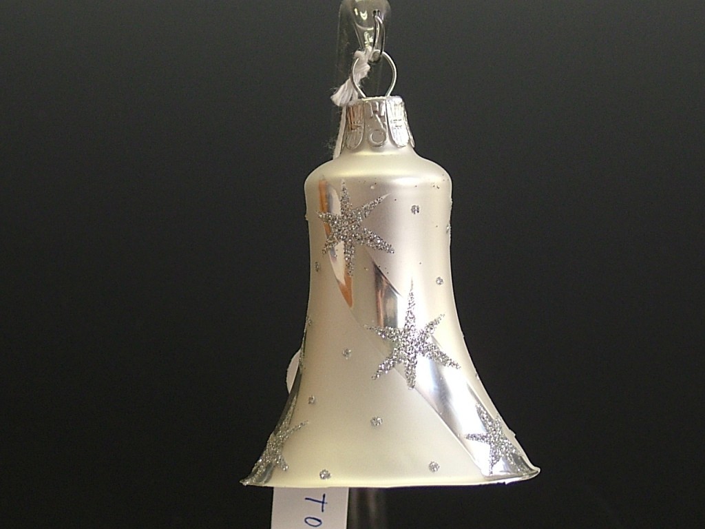+420 731 683 257vanocniozdoby@slezska-tvorba.czSkleněná vánoční ozdoba ve tvaru zvonku, hladký, bílý, mat, stříbrný dekor hvězdy, velikost 5,5 cm, foto ilustrační