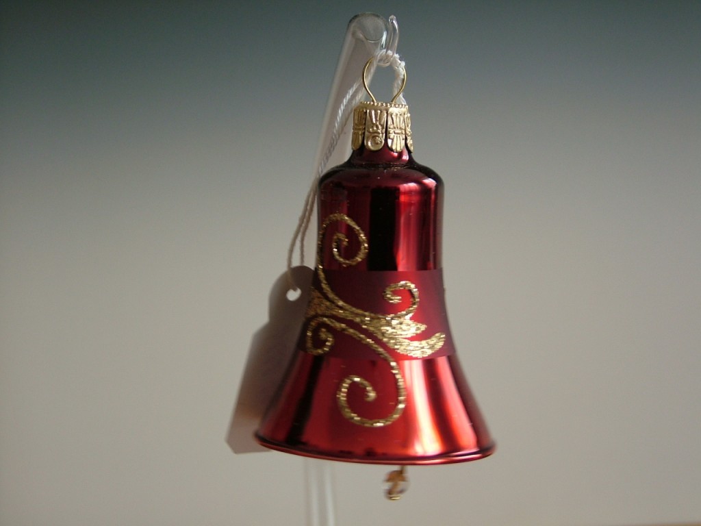 Skleněná vánoční ozdoba ve tvaru zvonku, hladký, bordó, lesk, zlatý plast. dekor, velikost 5,5 cm, foto ilustrační