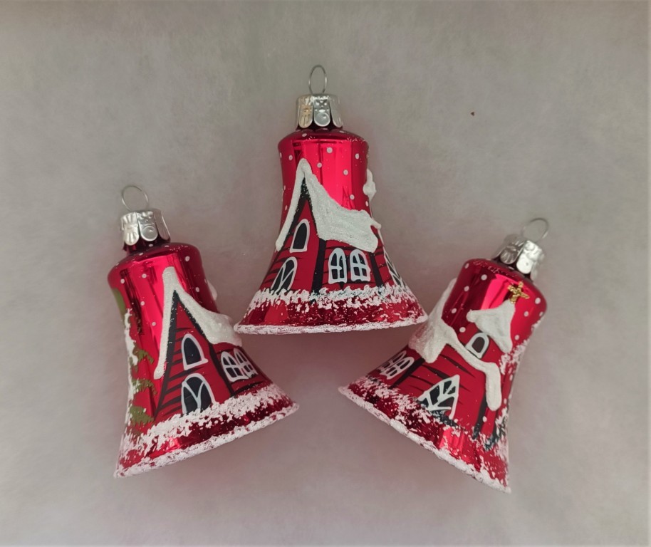 Skleněná vánoční ozdoba, zvonek, volně foukaný, červený, lesk, ručně malovaný plastický dekor, zimní motiv. Foto ilustrační. Velikost 5,5 cm.