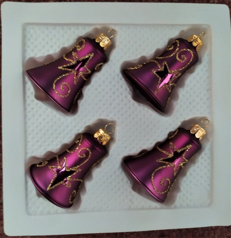 Skleněná vánoční ozdoba ve tvaru zvonku, hladký, tmavě fialový, mat, plast. zlatý dekor hvězd, velikost 5,5 cm, foto ilustrační