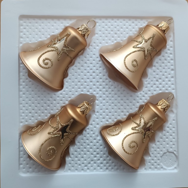 +420 731 683 257vanocniozdoby@slezska-tvorba.czSkleněná vánoční ozdoba ve tvaru zvonku, hladký, zlatý, mat, plastický. zlatý dekor hvězd, velikost 5,5 cm, foto ilustrační