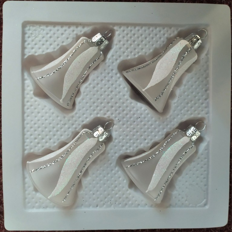 Skleněná vánoční ozdoba ve tvaru zvonku, hladký, průhledný, bílý, mat, dekor, velikost 5,5 cm, foto ilustrační